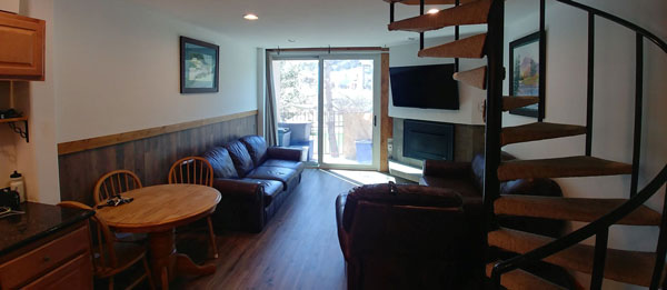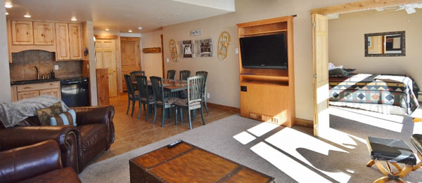 This ski-in/ski-out 1 bedroom plus den condominium has a full kitchen, living room and dining area. This condo is pet friendly. The master bedroom has a queen bed, the den has a queen bed, the living room has a sleeper sofa. The unit is at the base of the Super Bee Lift, with great views of the Ski Mountain.